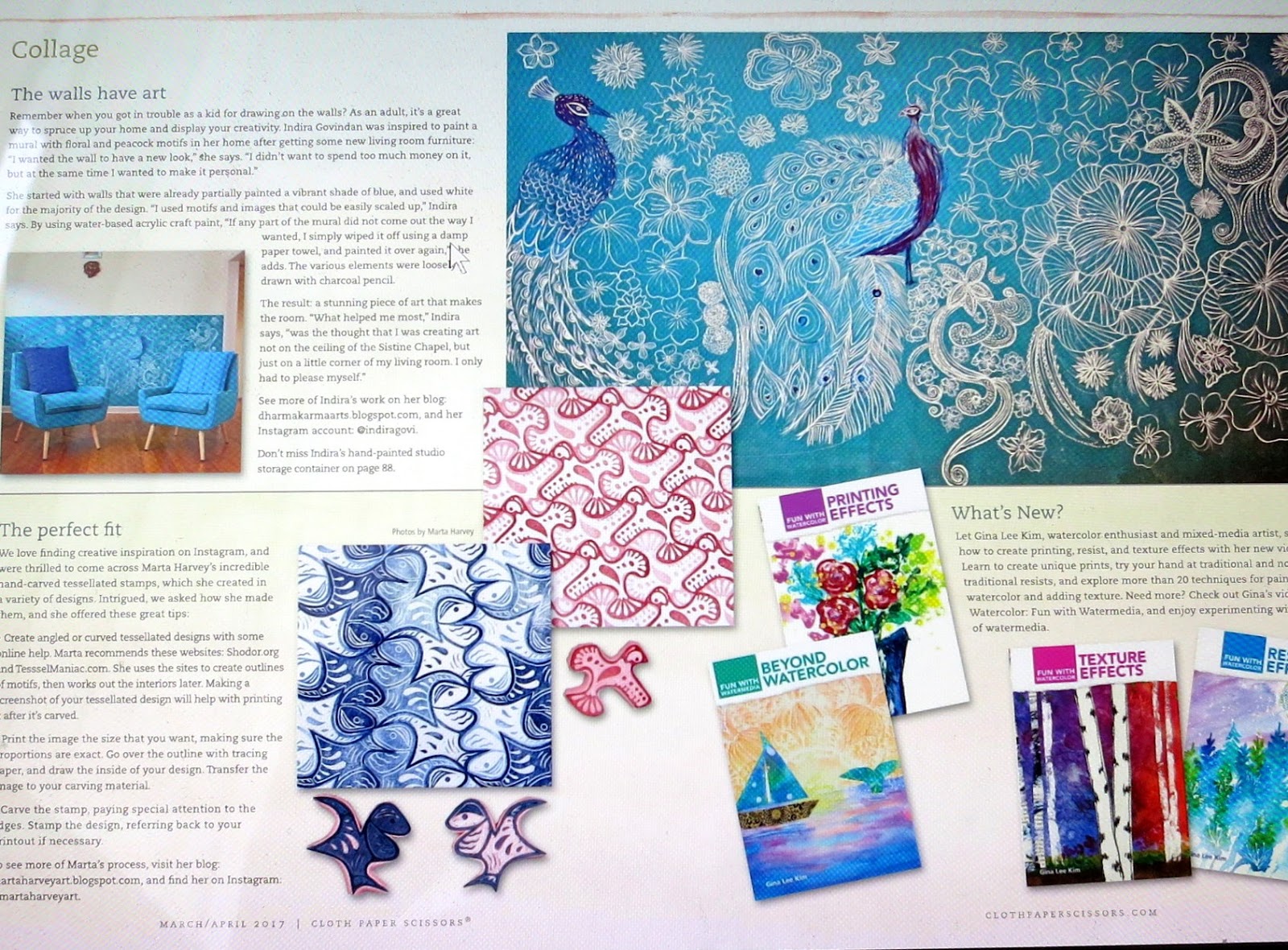 In other news, the March-April issue of Cloth Paper Scissors has featured two of my art projects: the wall mural I had done in my living room and a submission to the mixed-media studio accessory. Doing a happy dance!